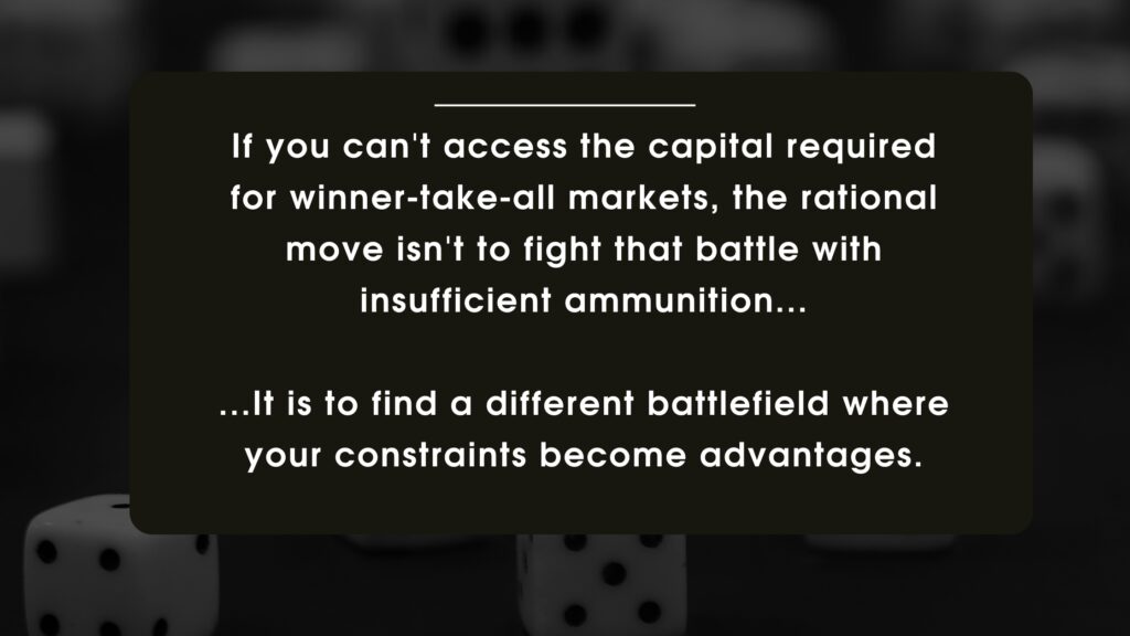 If you can’t access the capital required for winner-take-all markets, the rational move isn’t to fight that battle anyway with insufficient ammunition. The rational move is to find a different battlefield where your constraints become advantages. I call this finding your efficiency market.